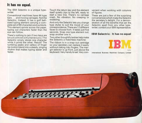 Finally, we’d send the copy up a pneumatic tube to the composing room where a machine friendly to the IBM Selectric type font would turn the words and numbers into lead ready for assembly into a page.